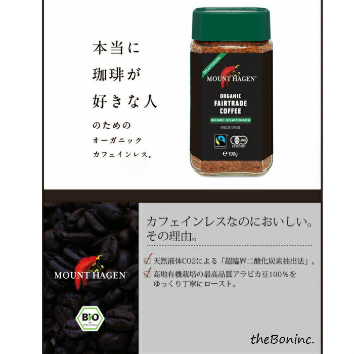 カフェイン残留率0.3%未満 商品説明 名称有機インスタントコーヒー 原材料名有機コーヒー豆(生豆生産国:パプアニューギニア、ペルー、メキシコ) 内容量100g 賞味期限別途商品パッケージに記載 保存方法直射日光、高温多湿を避けて保存してください。