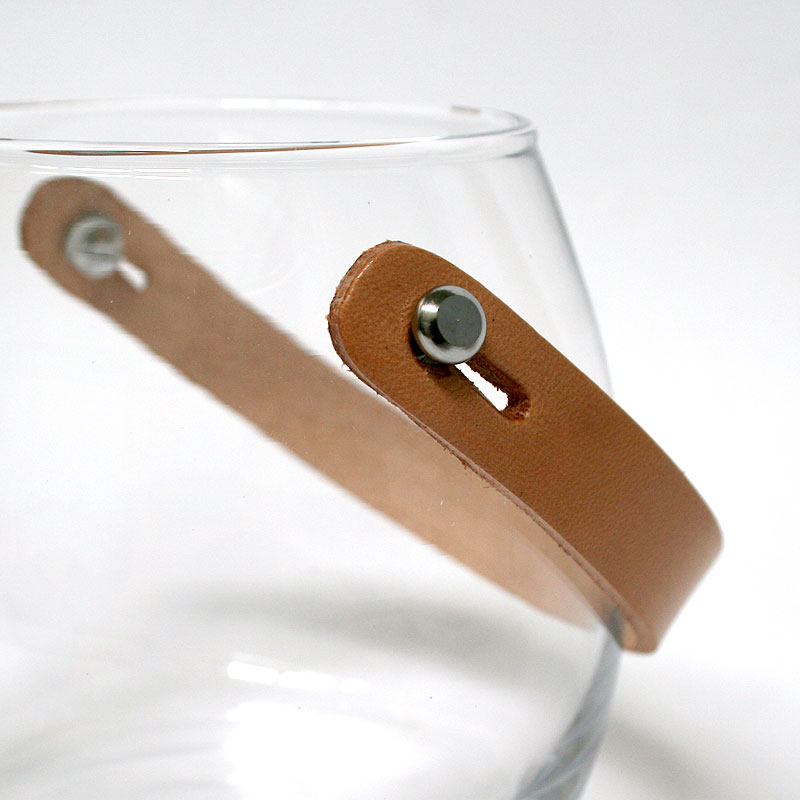 吹きガラスのボディに、天然皮革のストラップの組み合わせが、とても現代的な印象。