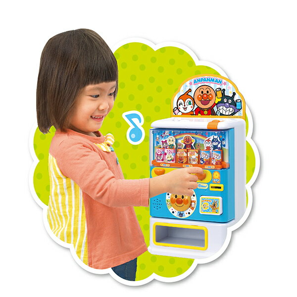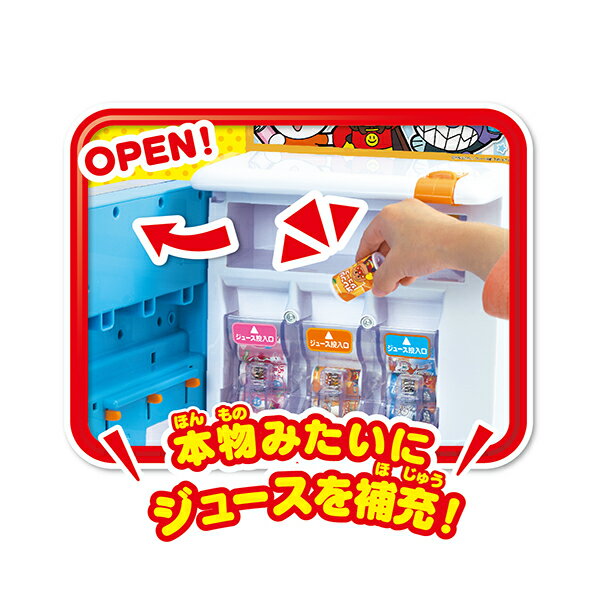 本物みたいに遊べちゃう!アンパンマンのじどうはんばいき! 【セット内容】 本体、かんばん1枚、ジュース12本、ジュースのシール2枚、ばいきんまんゴミばこ1個、おさいふ1個、カード1枚、コイン12枚 ■対象年齢 3才〜 ■価格 5,800円(税別) ■サイズ W300mm×H350mm×D170mm ■電池 単3×2本(別売)本物みたいに遊べちゃう!アンパンマンのじどうはんばいき! コインを入れてレバーをさげると選んだジュースが出てくる自販機のおもちゃ! ジュースを買うとルーレットが回ってアンパンマンとなかまたちのおしゃべりが流れます!アタリも出ちゃうかも!? 扉を開けてジュースの補充ができて本物みたいに遊べます! 空き缶はばいきんまんゴミ箱へ!遊びながらマナーも身に付けられます!